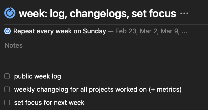 2025 is exciting year. It is also the year I set out to do weekly public logs which look like this in Things as recurring task.